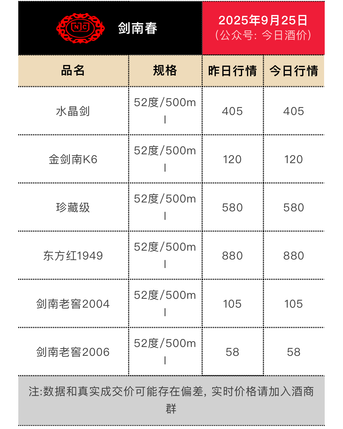 增速放缓的背后,实际上是剑南春对于单一产品高度依赖的结构性问题。在乔愚上任后,继承了此前的大单品战略,其核心大单品水晶剑对公司的收入贡献占比在8成以上。然而,从2024年底开始,水晶剑就一直出现价格倒挂的现象, 2024年“双十一”期间,电商平台将水晶剑价格砍至309元/瓶,比410元/瓶的出厂价低101元。而今日酒价显示,9月25日,水晶剑市场价为405元/瓶,仍低于出厂价。