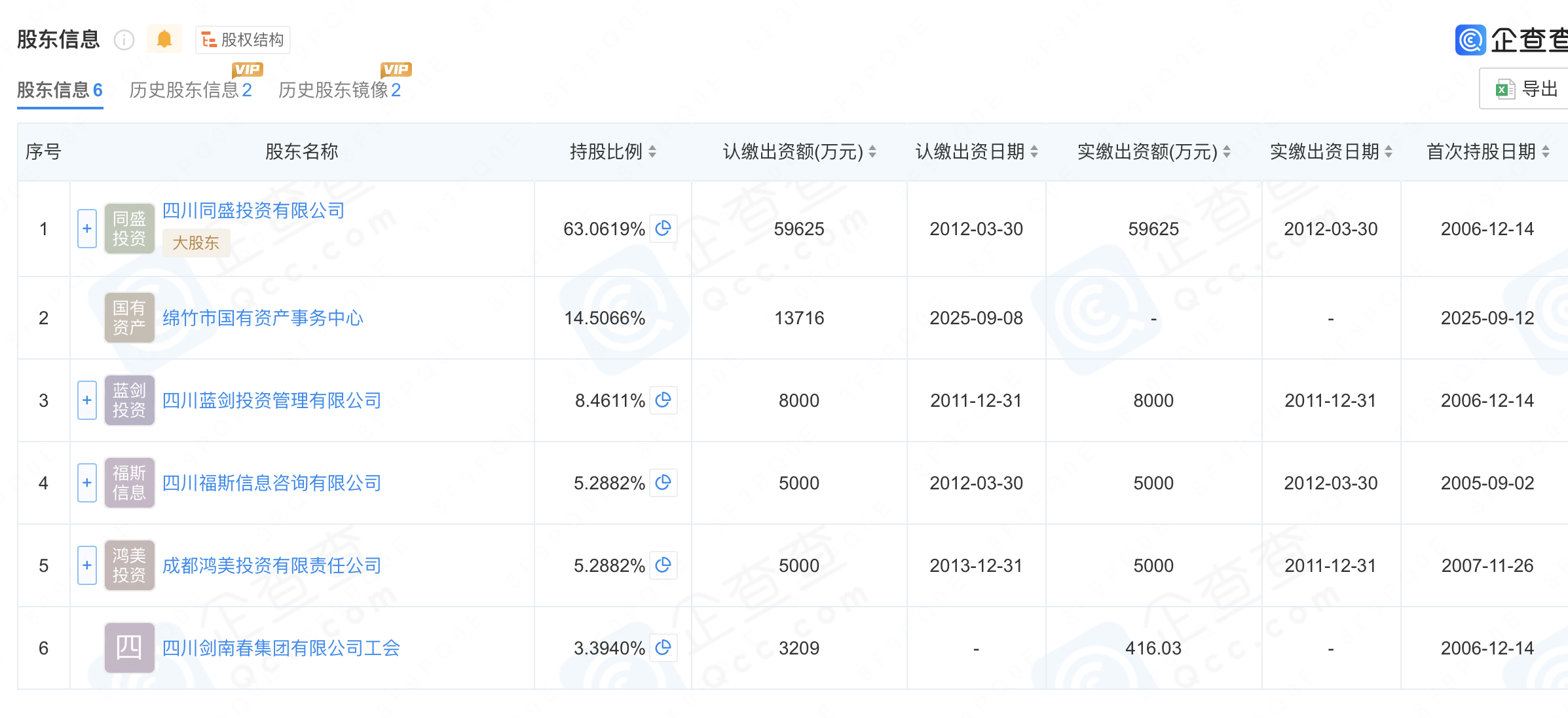 2025年9月,绵竹市国有资产事务中心通过认缴1.37亿元,获得剑南春集团14.51%股权,成为第二大股东。这意味着继2004年剑南春由国企改制为民企后,国资再次介入剑南春股权结构。这一股权变动也导致第一大股东四川同盛投资有限公司的持股从74.14%降至63.06%,其绝对控制权在一定程度上被削弱。