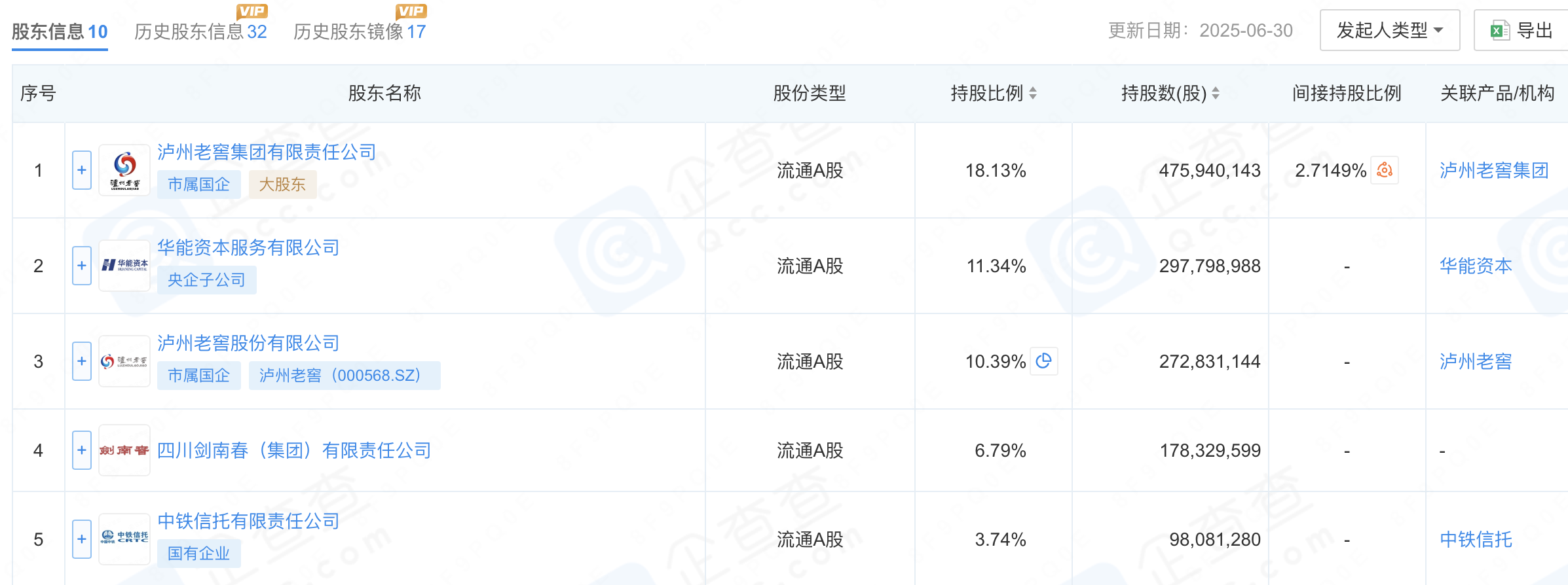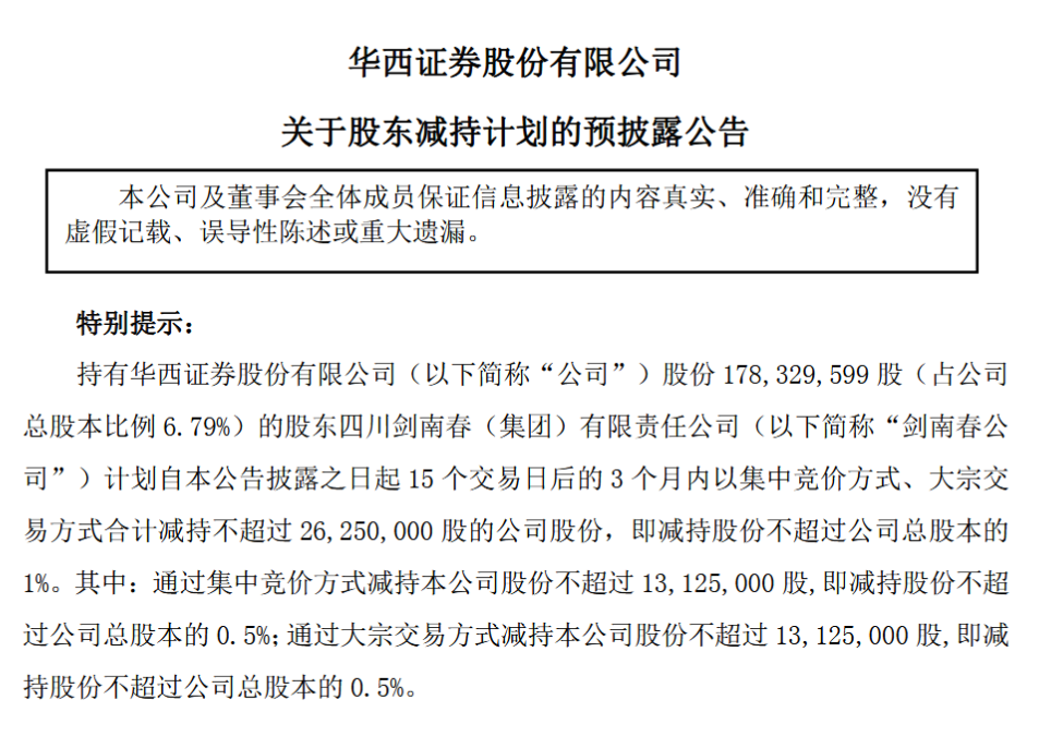 华西证券发布的公告详细披露了剑南春的减持计划。根据公告,剑南春目前持有华西证券1.78亿股,占总股本的6.79%。公开资料显示,剑南春为华西证券第四大股东,而前三大股东分别是泸州老窖集团有限责任公司、华能资本服务有限公司和泸州老窖股份有限公司,持股比例分别为18.13%、11.34%和10.39%。